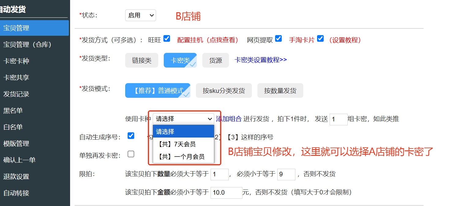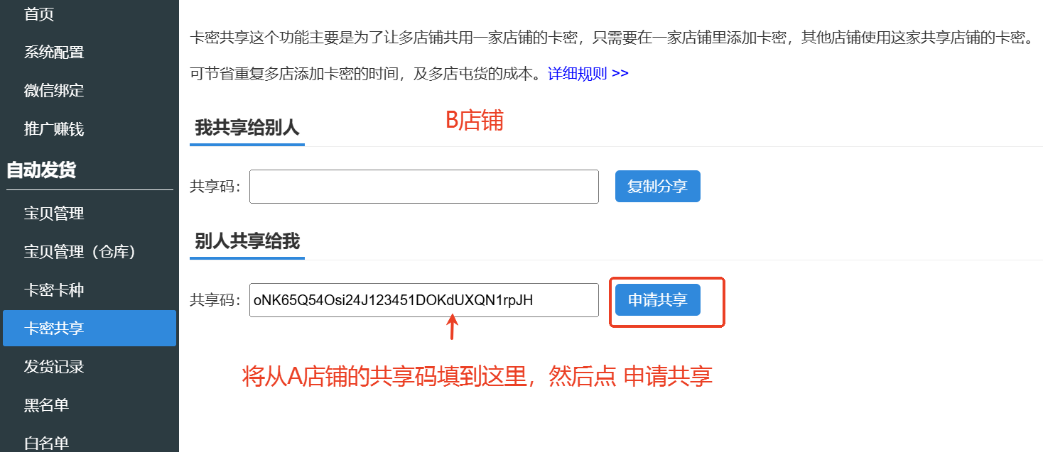 注:B店铺申请卡密共享之后,不能同时使用自己店铺的卡密,只能使用一个店铺来源的卡密