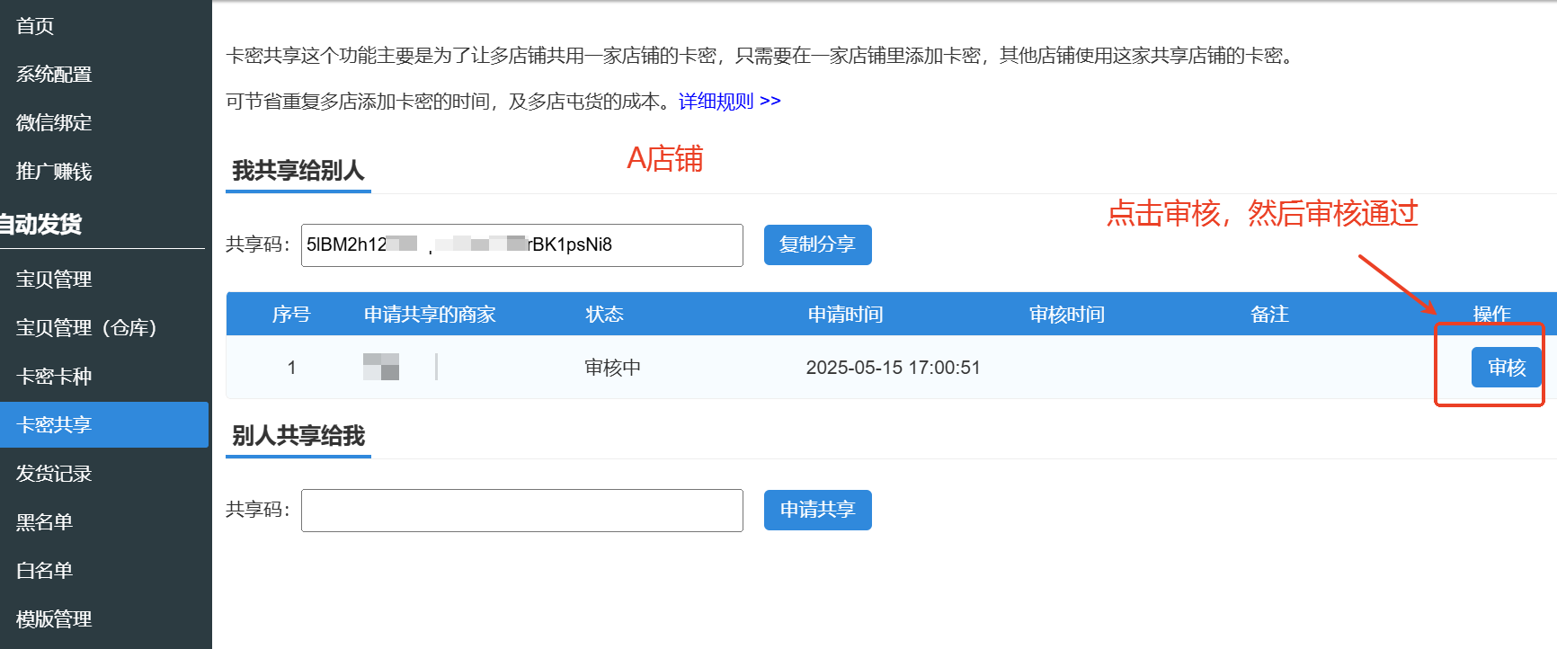 A店铺进入后台 -> 左侧菜单 -> 卡密共享