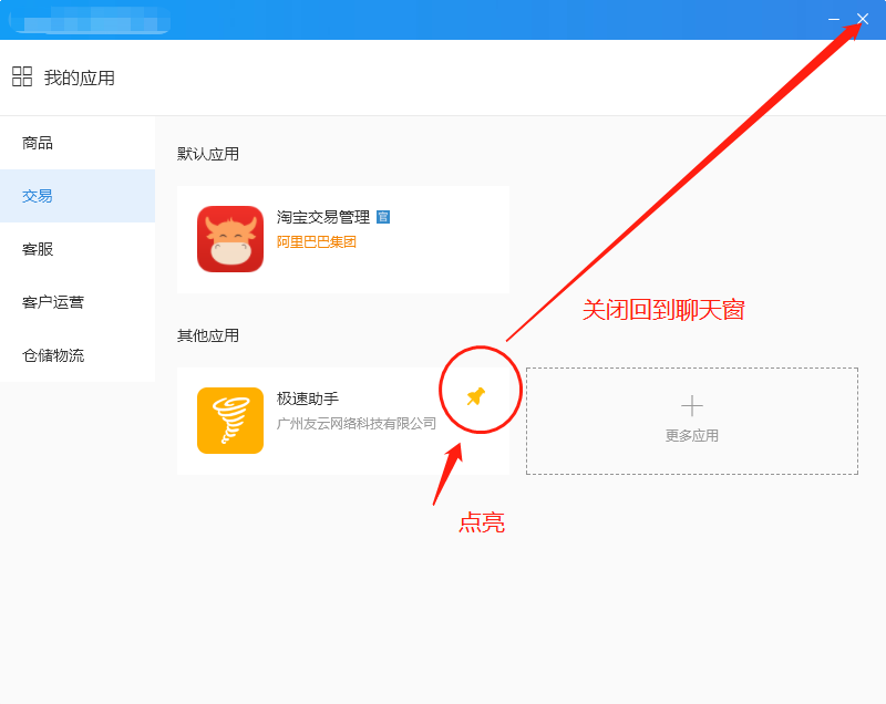 点击“交易”-找到极速助手,“点亮极速助手”后,关闭窗口回到聊天窗(如没有找到极速助手,麻烦退出千牛,重新登录看看)